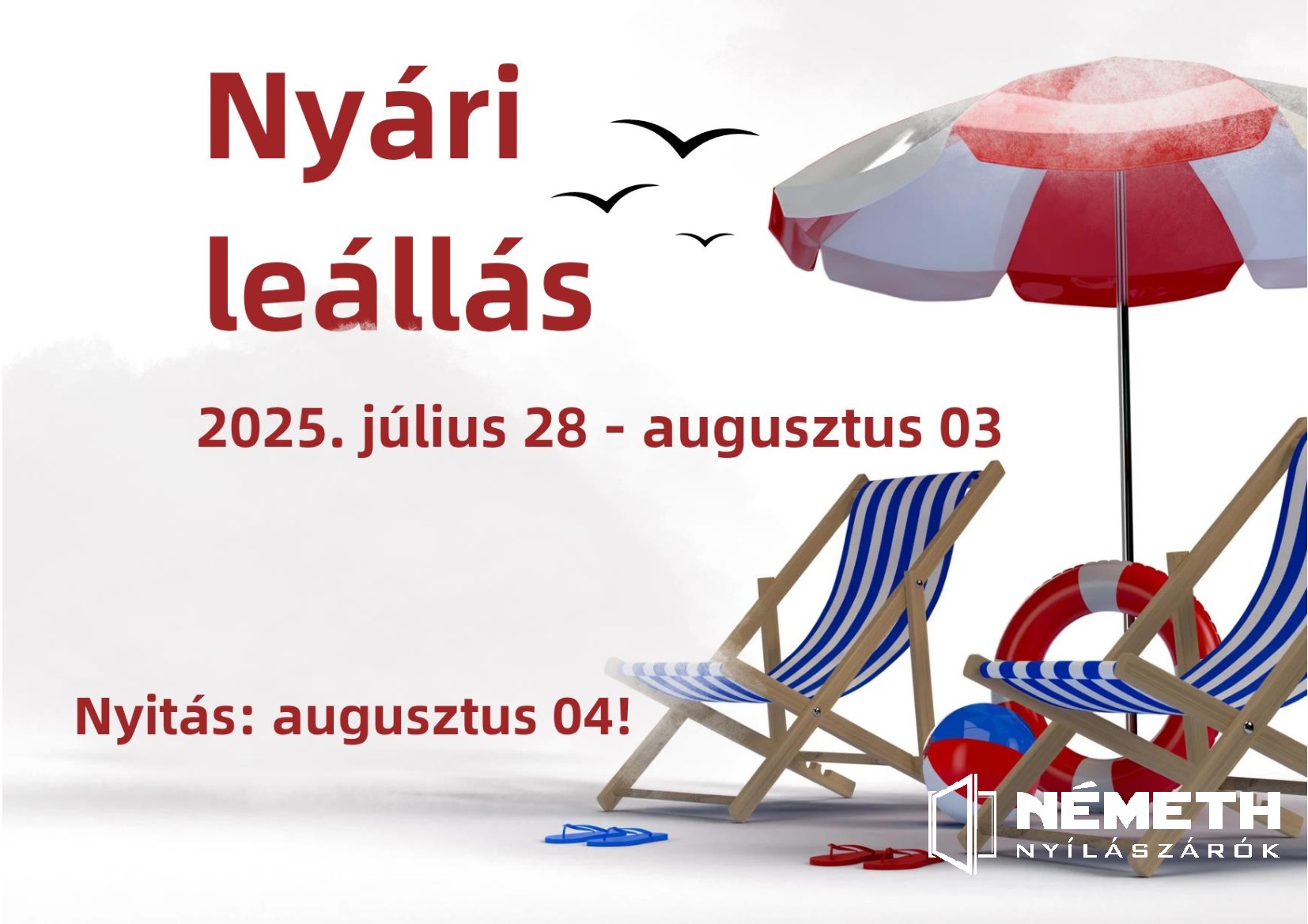 Ezúton értesítjük kedves ügyfeleinket, hogy a Németh Nyílászáró Gyártó és Forgalmazó Kft. 2025. július 28. (hétfő) és augusztus 3. (vasárnap) között nyári leállás miatt zárva tart.